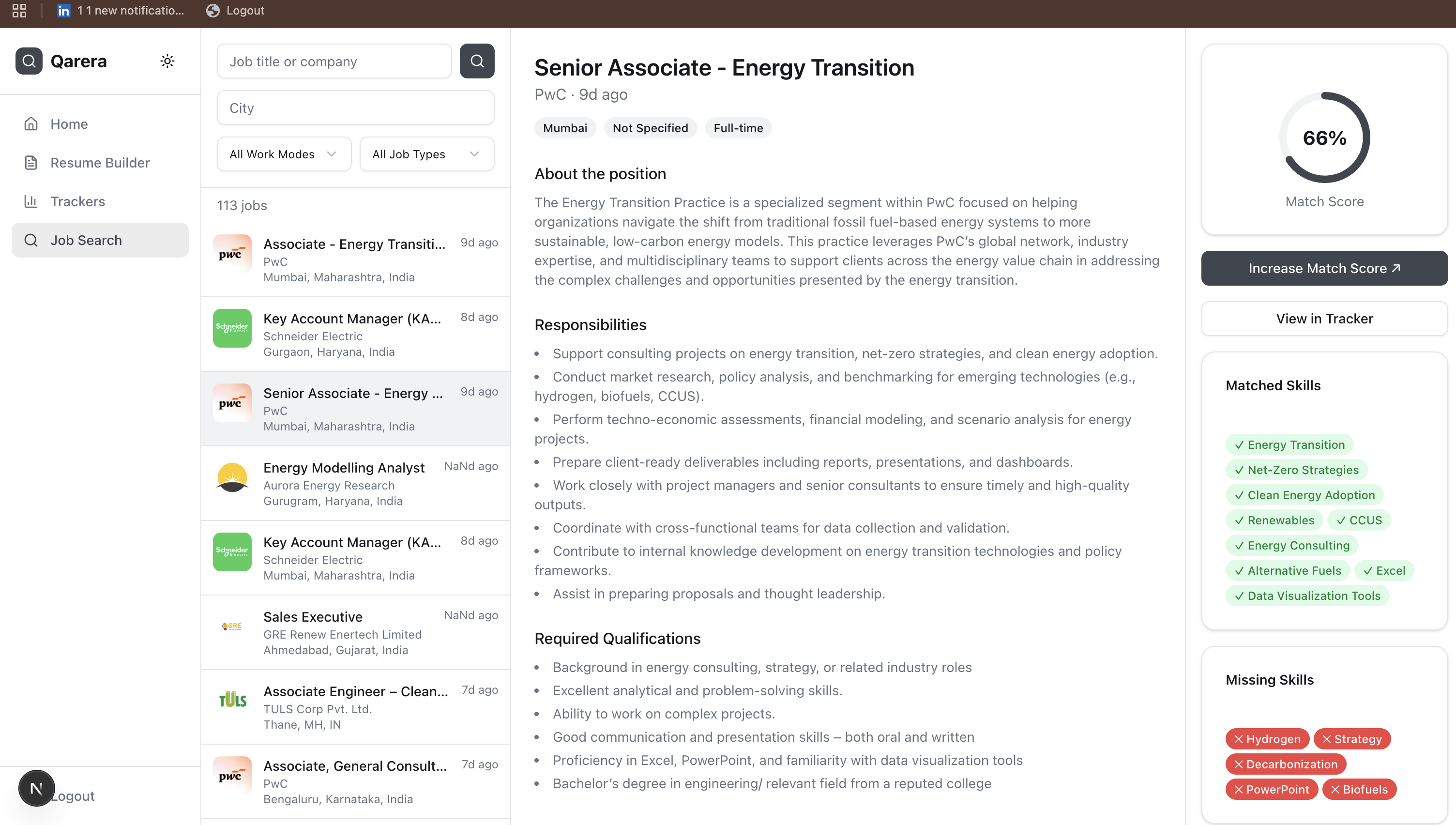 Unlike job boards, Qarera focuses on active job seekers with AI-powered matching, resume optimization, keyword analysis, and a dedicated application tracker to manage your entire job search.